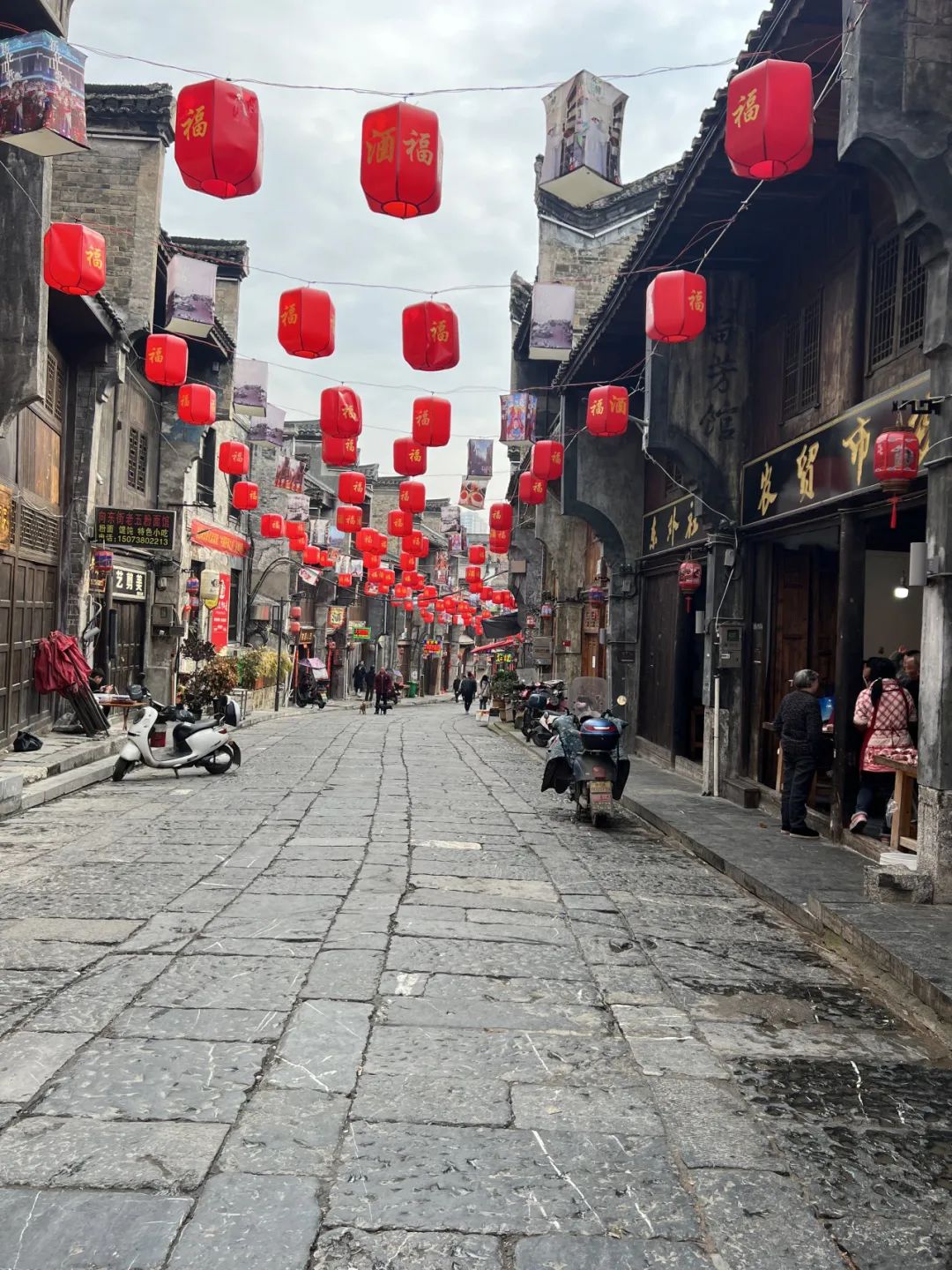 縣城有一條青石古街,緊鄰河畔和碼頭,早年間有早市和早餐店,后來(lái)慢慢成為返鄉(xiāng)人的打卡點(diǎn),每到過(guò)年,人們都習(xí)慣約在這里吃早餐。于是,政府也順勢(shì)而為,這幾年發(fā)力文旅,索性把這里改造成景點(diǎn),每逢春節(jié),就掛滿紅燈籠,成為城里年味最重的地方。