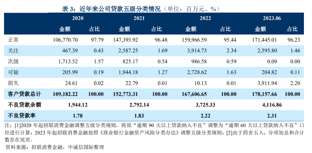 此外,2021 年 3 月,招商銀行發(fā)布公告稱,啟動招聯(lián)金融上市研究工作;2022 年 10月,招商銀行和中國聯(lián)通分別發(fā)布公告稱,雙方董事會審議通過了《關(guān)于招聯(lián)消費金融有限公司整體變更為股份有限公司的議案》;2023 年 7 月,公司完成股份制改造,名稱由“招聯(lián)消費金融有限公司”變更為“招聯(lián)消費金融股份有限公司”,中誠信國際將持續(xù)關(guān)注公司上市進展。