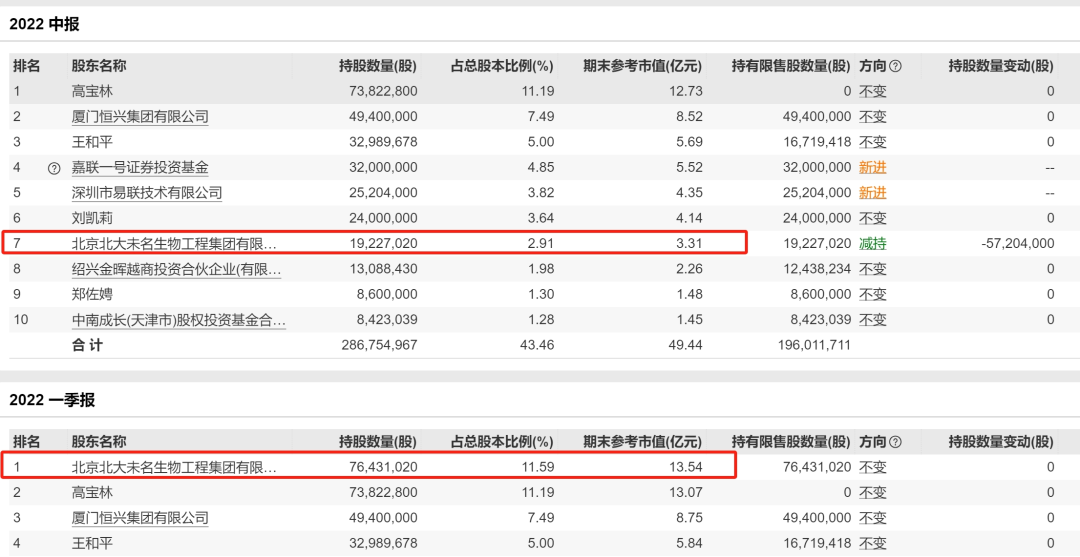公開(kāi)數(shù)據(jù)顯示,截至2022年一季度,未名集團(tuán)還是未名醫(yī)藥大股東,持股比例11.59%;至2022年年中,未名集團(tuán)持股比例已降至2.91%,僅為第七大股東。