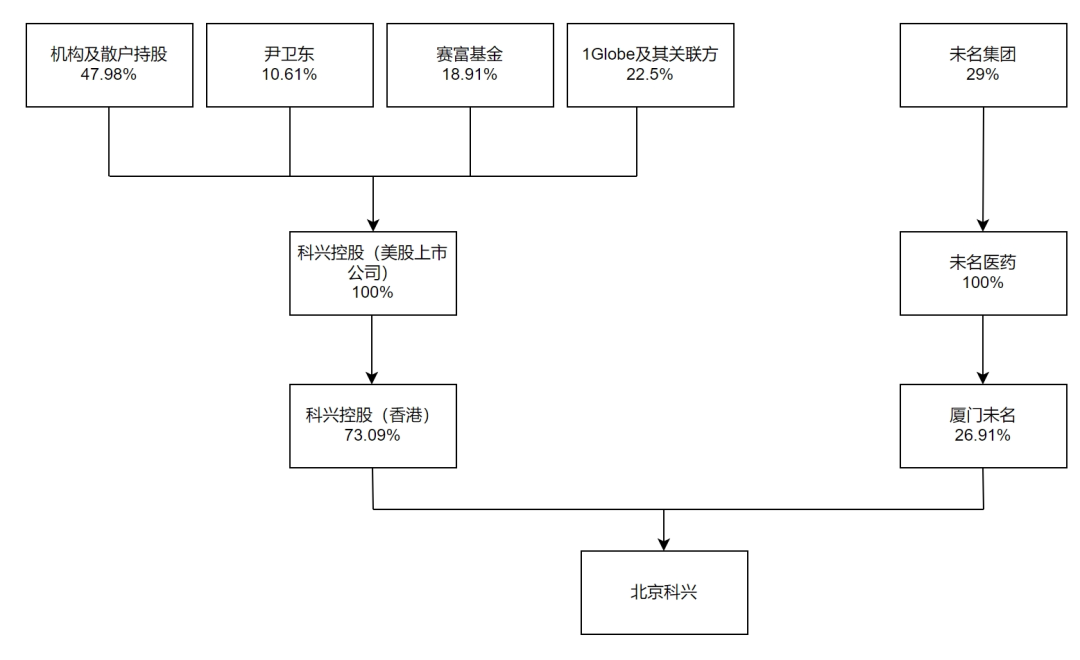 起初,潘愛(ài)華實(shí)控的未名集團(tuán)是北京科興的大股東;但為了給北京科興赴美上市鋪路、搭建紅籌架構(gòu),未名集團(tuán)將大部分股權(quán)讓渡至尹衛(wèi)東持股并擔(dān)任董事長(zhǎng)的科興控股名下,改為以簽署備忘錄,約定未名集團(tuán)享有對(duì)北京科興10項(xiàng)重大事項(xiàng)一票否決權(quán),以及董事長(zhǎng)、法定代表人的永久委派權(quán)利的方式,實(shí)控北京科興。