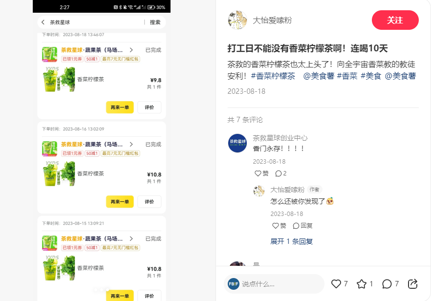 據(jù)說,除了上方漂浮著的幾片香菜葉以外,飲品內(nèi)還加入了搗碎后的香菜梗。小紅書網(wǎng)友“榴蓮臭轟轟”表示,加入了香菜后的檸檬茶,“散發(fā)出一股遠(yuǎn)遠(yuǎn)都能聞到的清香”。而小紅書用戶“大怡愛嗦粉”則表示,自己已經(jīng)連喝10天。