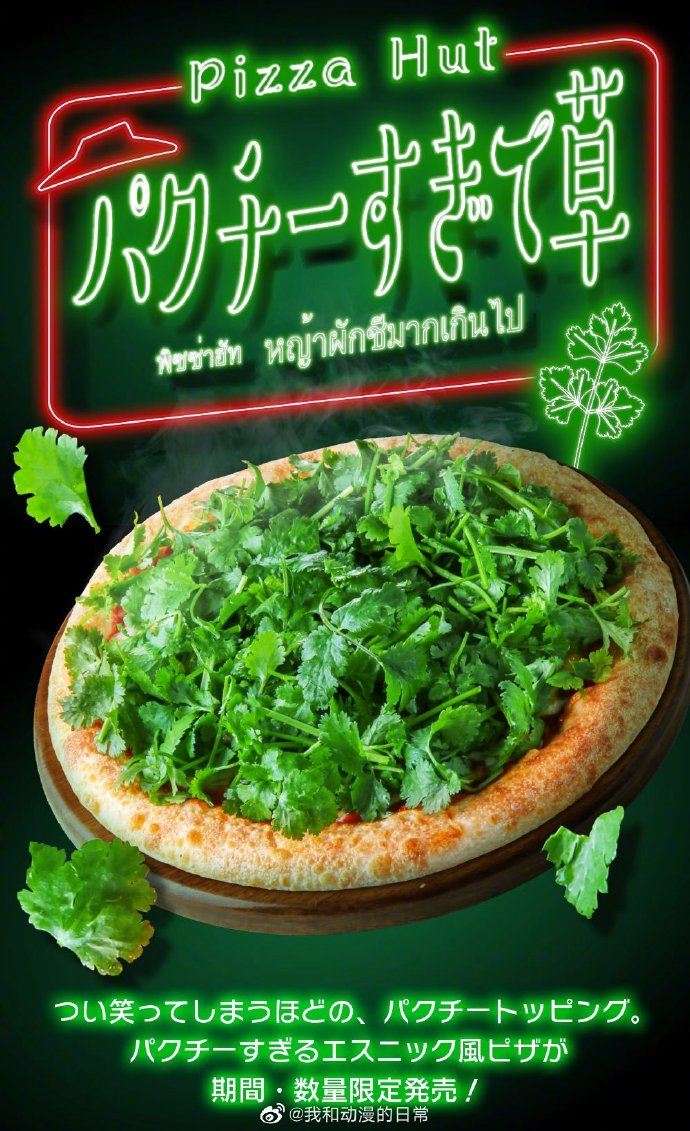 必勝客在日本推出的香菜披薩,宣傳海報(bào)更是很直白地標(biāo)出了“香菜太多了!”的文案。