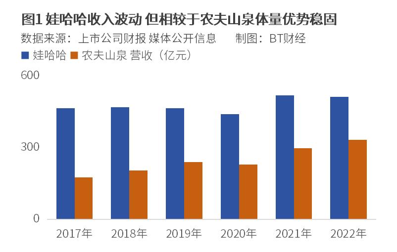 但即便娃哈哈是在營收的低谷,也就是460億元左右,它的收入體量也高于農(nóng)夫山泉。據(jù)后者財報顯示,從2017年到2022年,公司營收從不到175億元增長到超330億元。