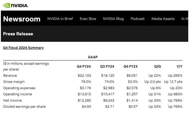 英偉達(dá)當(dāng)天公布的財(cái)報(bào)數(shù)據(jù)顯示,按照美國通用會計(jì)準(zhǔn)則,第四季度收入221億美元,同比增長265%,凈利潤122.85億美元,同比增長769%。這兩項(xiàng)關(guān)鍵指標(biāo)雙雙超出市場預(yù)期。