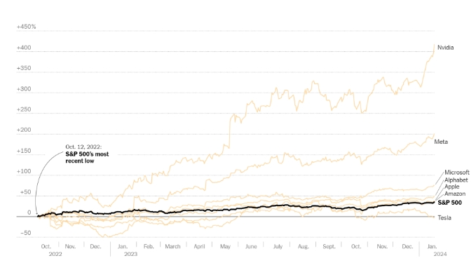 在這7只股票中,英偉達(dá)的漲幅則是遙遙領(lǐng)先,從2022年年底至今不到兩年的時(shí)間內(nèi),漲幅超過400%。