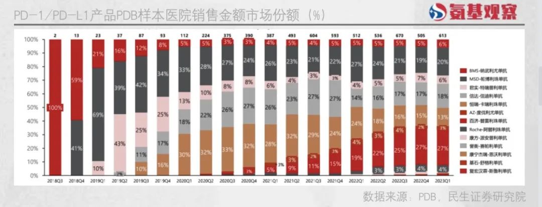 只是,優(yōu)勢(shì)并沒有保持太長(zhǎng)時(shí)間。此后,O藥便被K藥超越。隨著國(guó)產(chǎn)PD-1的逐步上市,O藥的處境更加艱難。如下圖所示,在醫(yī)院中其市場(chǎng)份額一度下滑至3%。