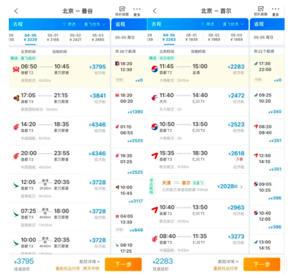 以4月30日-5月5月北京飛泰國曼谷往返機票價格為例,目前(2月23日)查詢最低價格不到3800元,北京飛韓國首爾往返價格則不到2300元,北京飛新加坡往返總價在6200元左右,北京飛倫敦隨需中轉(zhuǎn),往返價格最低僅為4500元左右。