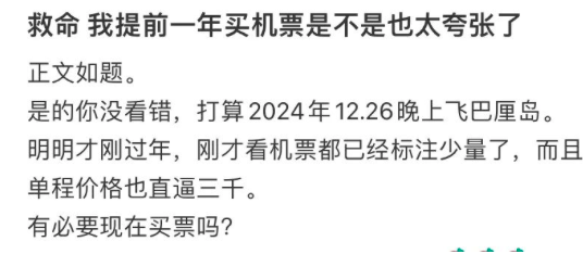 不過也有網(wǎng)友表示,能夠提前計劃自己全年旅行的大前提是時間自由,并不適用于大多數(shù)“打工人”,如果產(chǎn)品買好了計劃做好了,到時候假期出問題,很多機票也會是有扣費的。于此同時,價格如何波動不可控,去年十一時也出現(xiàn)過臨近假期反而降價的情況,提前預(yù)訂反而遭“背刺”,看看五一產(chǎn)品還算合理,現(xiàn)在就訂十一甚至年底的機票,風(fēng)險有點大。