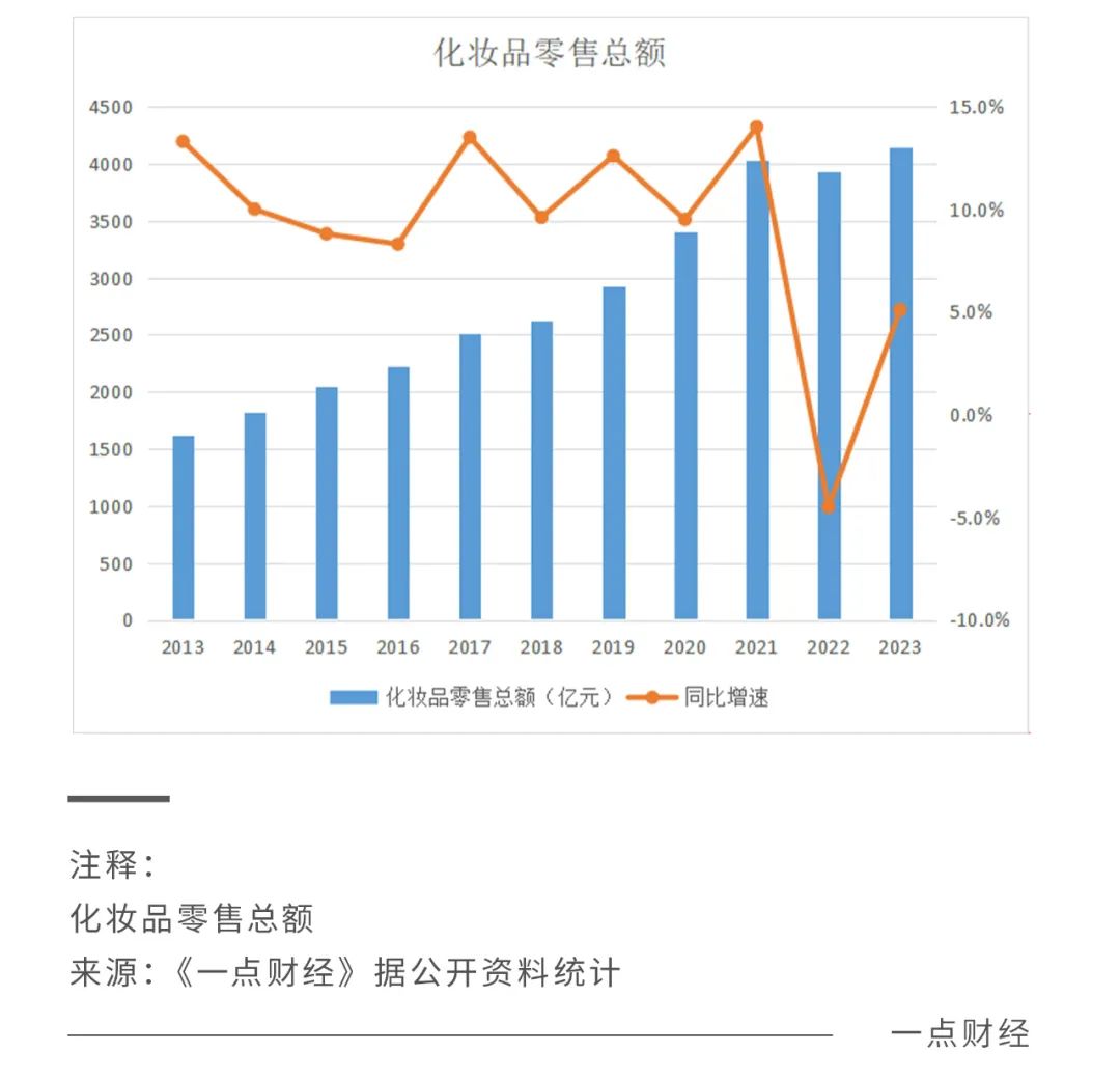 在這一年,中國化妝品行業(yè)風(fēng)云激蕩,有市場(chǎng)復(fù)蘇的欣喜,也有增長(zhǎng)放緩落實(shí)的憂慮。來自國家統(tǒng)計(jì)局的數(shù)據(jù)顯示,2023年全年,限額以上化妝品類總零售額雖然再創(chuàng)新高,達(dá)到了達(dá)到4142億元,但增幅為5.1%,僅高于2022年的-4.5%,并未回到疫情前水平。
