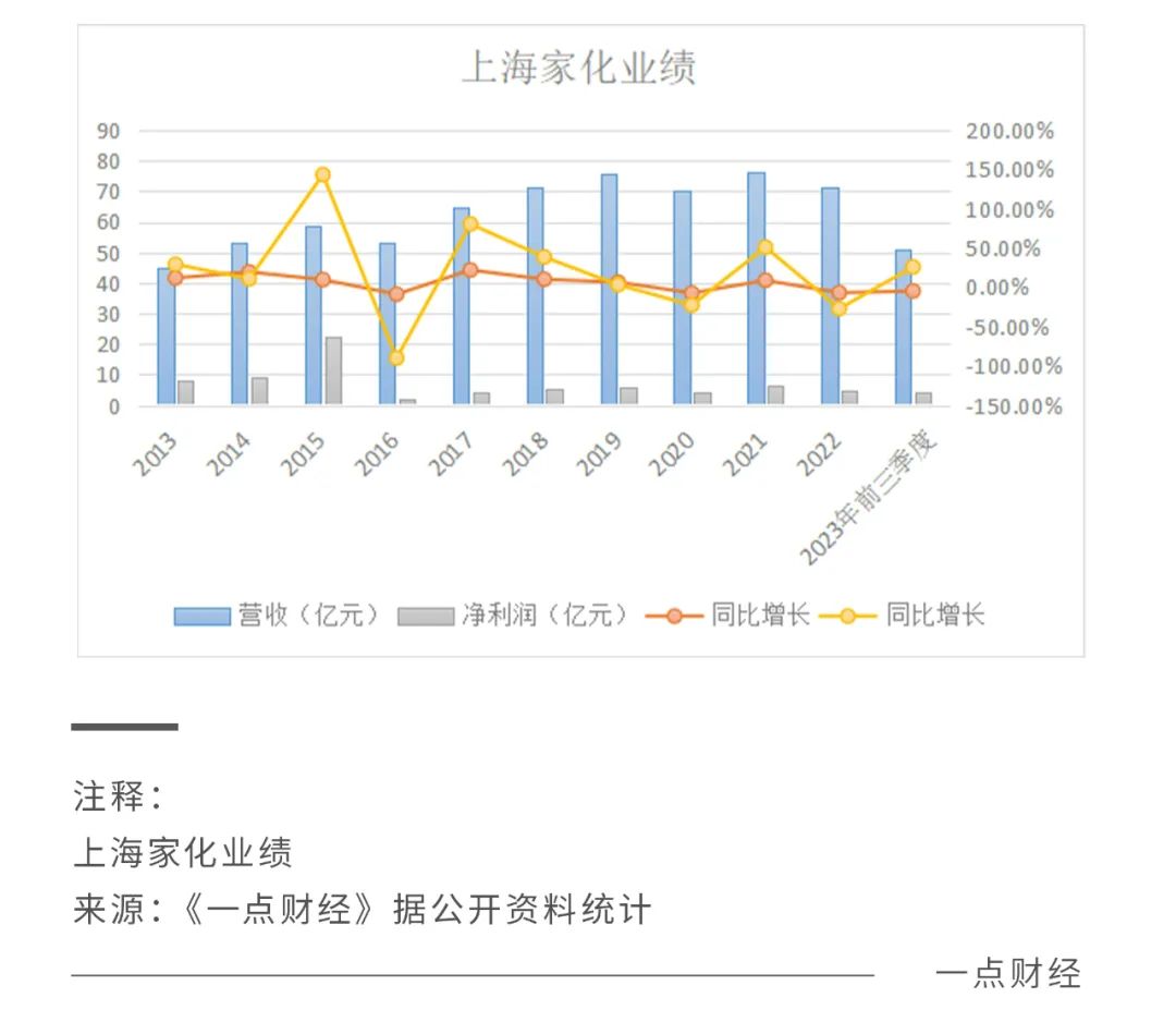 一度,上海家化是國貨的市值天花板、營(yíng)收天花板。據(jù)《一點(diǎn)財(cái)經(jīng)》統(tǒng)計(jì),上海家化全年?duì)I收最高是2021年的76.46億元,近年來營(yíng)收呈現(xiàn)負(fù)增長(zhǎng)。2023年前三季度,其營(yíng)收為50.91億元,從-4.91%的增速來看,很難打破自己創(chuàng)下的營(yíng)收天花板。