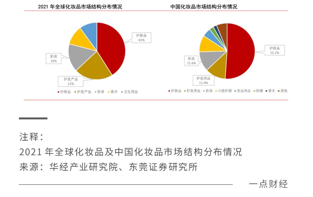 與彩妝相比,護(hù)膚市場(chǎng)的規(guī)模更大,競(jìng)爭(zhēng)也更為激烈,國貨崛起的難度也更大。東莞證券援引Frost &Sullivan的數(shù)據(jù)顯示,2021 年中國化妝品市場(chǎng)中,護(hù)膚品、護(hù)發(fā)用品、彩妝的比重分別為 51.2%、11.9%和 11.6%。