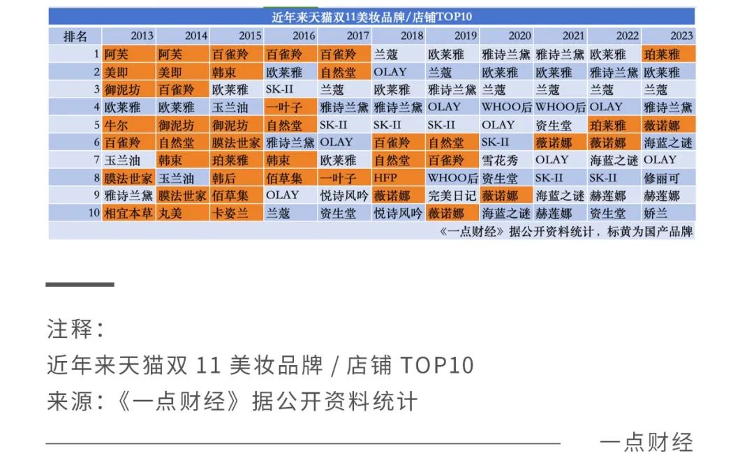 十多年來,天貓雙11成為了每一輪國貨崛起的見證者與記錄者。2013-2017年,天貓雙11美妝品牌前十中,阿芙、百雀羚先后成為TOP1,御泥坊、膜法世家、韓束、一葉子等也成為榜單???;2018年后尤其是近兩年來,薇諾娜、珀萊雅成為唯二上榜品牌。