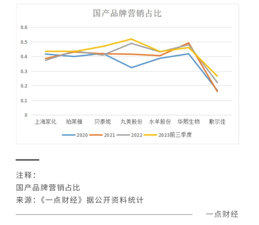 一直以來,國貨多憑借著對(duì)中國市場(chǎng)細(xì)致入微的洞察,修煉好了營(yíng)銷力。據(jù)《一點(diǎn)財(cái)經(jīng)》統(tǒng)計(jì),2016年來,多數(shù)國產(chǎn)品牌的營(yíng)銷費(fèi)用在40%上下,今年前三季度,丸美股份、貝泰妮、華熙生物、水羊股份、珀萊雅的營(yíng)銷費(fèi)用達(dá)51.82%、46.78%、46.03%、43.29%、43.27%。