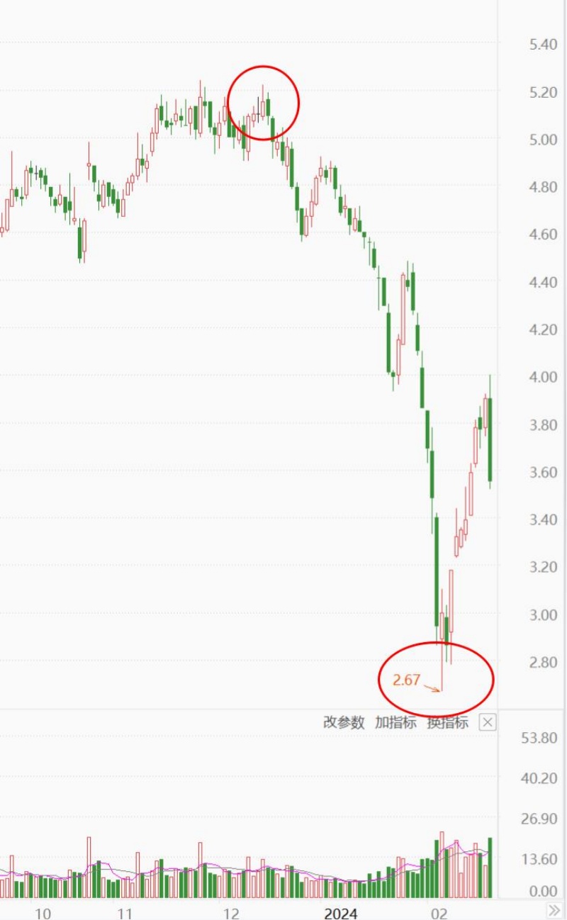 2023年12月14日,正元地信股價(jià)最高點(diǎn)為5.22元/股,當(dāng)天收盤(pán)有所回落。第二天收了一根陰線(xiàn),股價(jià)就從這天開(kāi)始下跌。到2024年2月6日,正元地信股價(jià)創(chuàng)新低2.67元/股,距離一個(gè)半月前的最高點(diǎn)幾乎跌去一半,跌幅達(dá)48.85%。股價(jià)出現(xiàn)如此極端的走勢(shì),只用不到兩個(gè)月的時(shí)間。