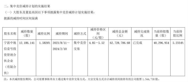到2024年2月19日,正元地信收到寧波中地信出具的《關(guān)于集中競(jìng)價(jià)減持計(jì)劃時(shí)間屆滿(mǎn)暨減持結(jié)果的告知函》。寧波中地信通過(guò)集中競(jìng)價(jià)方式累計(jì)減持1218.61萬(wàn)股,減持股份數(shù)量占公司總股本的1.5826%,本次集中競(jìng)價(jià)減持計(jì)劃減持時(shí)間屆滿(mǎn)。寧波中地信本次減持總金額達(dá)6272.87萬(wàn)元。