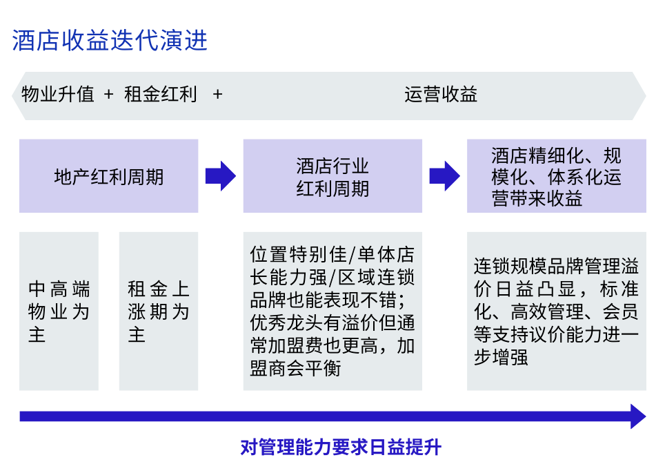 隨著宏觀經(jīng)濟環(huán)境變化導致的房地產(chǎn)行業(yè)墜落,“物業(yè)升值”給業(yè)主、加盟商和品牌商帶來的利益銳減,倒逼收益構(gòu)成體系逆轉(zhuǎn)為“運營收益”>“物業(yè)升值”,酒店核心利益獲取點發(fā)生本質(zhì)性變化。