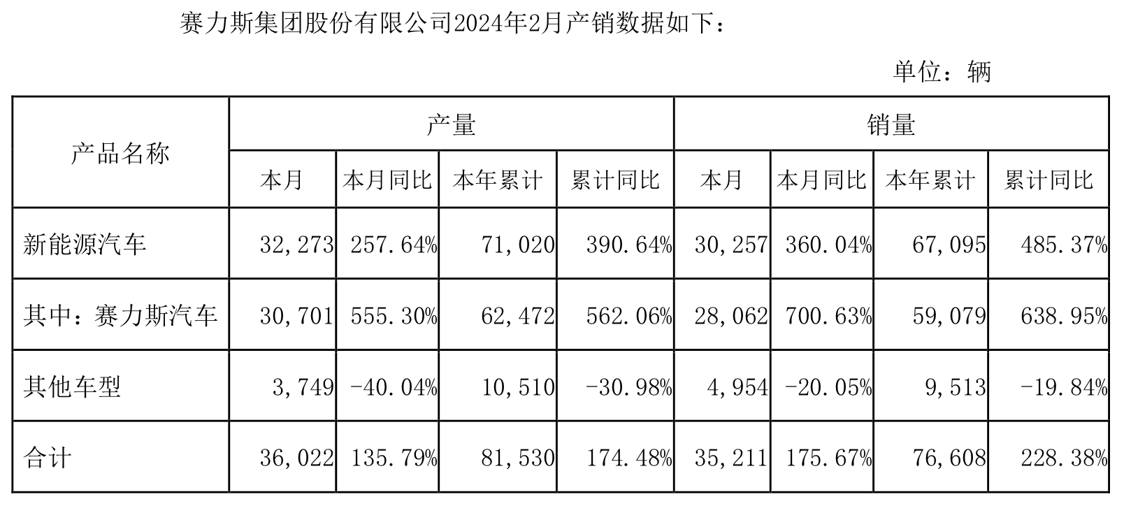 賽力斯(601127.SH)披露了2024年2月的產(chǎn)銷數(shù)據(jù),公司2月份產(chǎn)銷新能源汽車分別為32273輛和30257輛,當(dāng)月同比變化分別為257.64%和360.04%;這其中賽力斯汽車生產(chǎn)30701輛,銷量28062輛,同比增幅分別為555.3%和700.63%。如果看前兩個月的話,賽力斯累計(jì)產(chǎn)出71020輛,累計(jì)銷量67095輛。