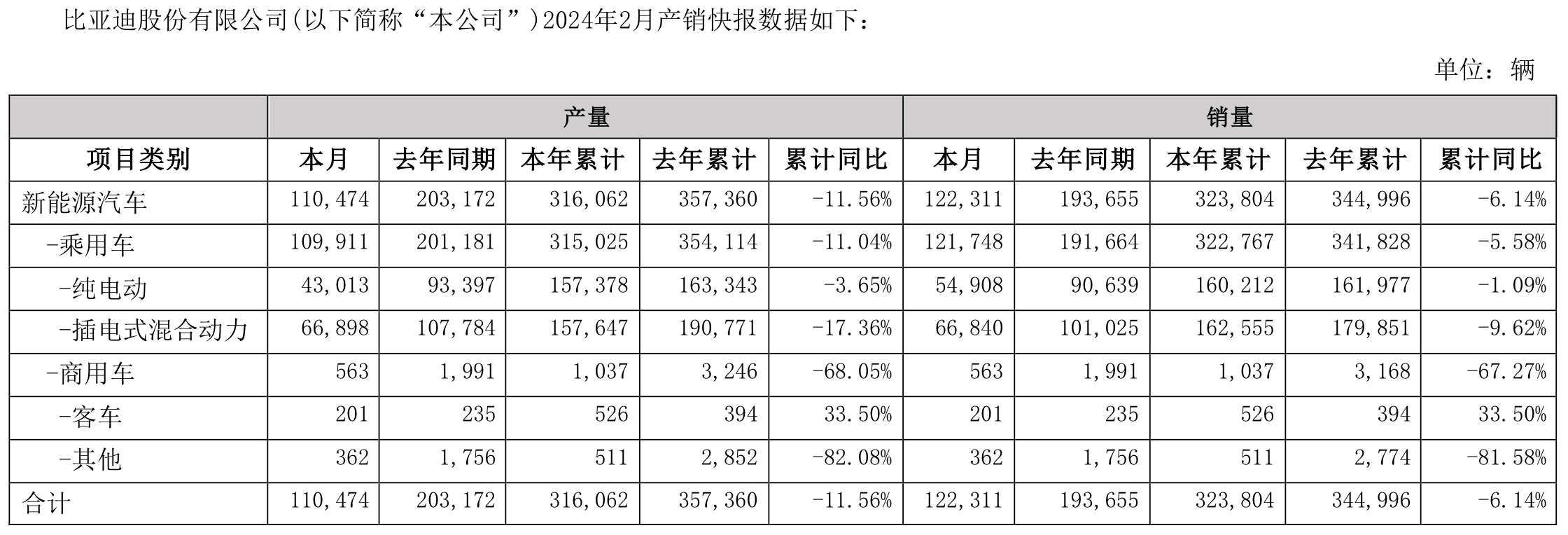 另一家比亞迪(002594.SZ)在3月1日晚間也披露了2月產(chǎn)銷快報,數(shù)據(jù)顯示,公司新能源汽車2月產(chǎn)量110474輛,去年同期為203172輛;2月銷量122311輛,去年同期193655輛,兩個數(shù)據(jù)都出現(xiàn)了同比下滑,今年2月份比去年2月份少賣7萬輛。累計(jì)看,本年累計(jì)賣出323804輛,去年累計(jì)銷量數(shù)為344996輛,同比下滑6.14%。
