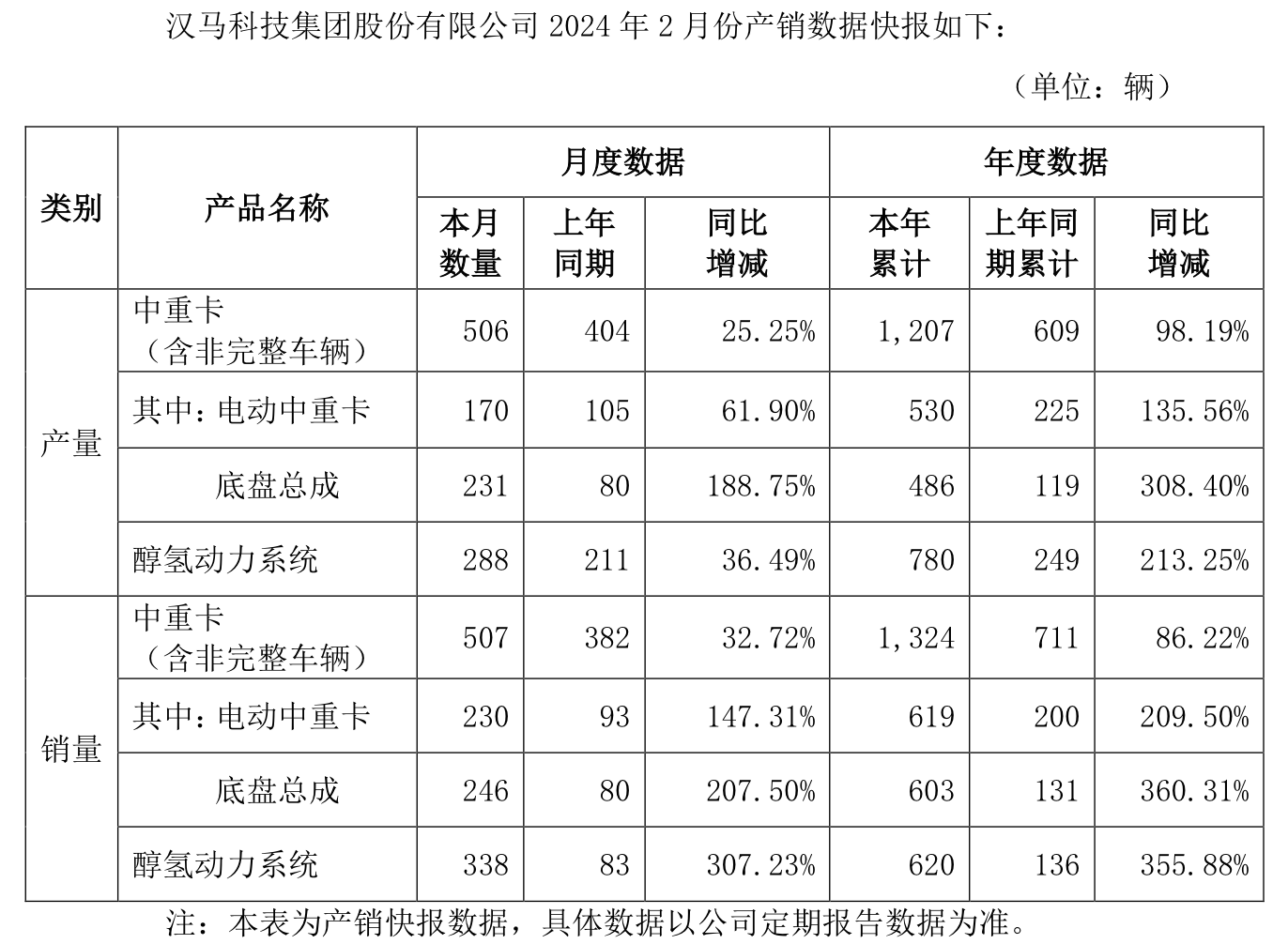另外漢馬科技(600375.SH)也披露,自己2月份中重卡產(chǎn)506輛,同比增長25.25%,銷售507輛,同比增長32.72%;本年累計(jì)產(chǎn)1207輛,增幅98.19%,銷1324輛,增幅達(dá)86.22%。