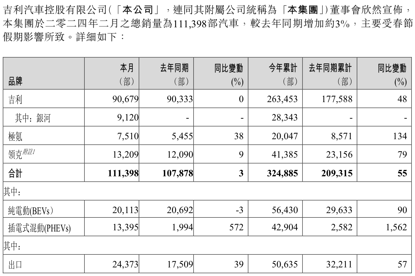 界面新聞還注意到,吉利汽車(00175.HK)在2月份中“吉利”銷售了90679輛,“極客”銷售了7510輛,“領(lǐng)克”銷售了13209輛,較去年同期均有增長(去年2月份的數(shù)據(jù)還分別是90333輛、5455輛、12090輛)。這也使得2月份吉利汽車共計(jì)銷售了111398輛,同比增長3%;今年累計(jì)銷售了324885輛,同比增長55%。