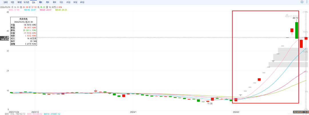 這只大牛股就是克來機(jī)電(603960.SH),從2月1日到27日,該股經(jīng)過連續(xù)13次漲停,最大漲幅超過了276%。