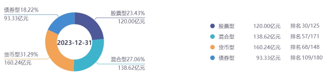 公司固收類和權(quán)益類基金分布相對平衡,管理規(guī)模皆在250億元左右。