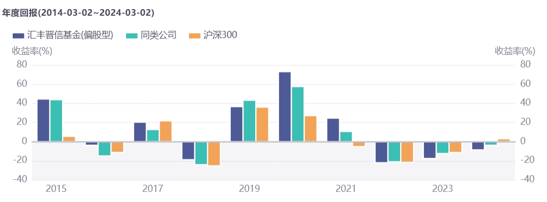 從權(quán)益類產(chǎn)品收益來看,2022年、2023年以及2024年(截至3月1日),匯豐晉信旗下股票型基金的平均收益率分別約為-22%、-18%、-9%,而同類公司平均收益率分別約為-21%、-12%、-4%,匯豐晉信處于平均線以下。