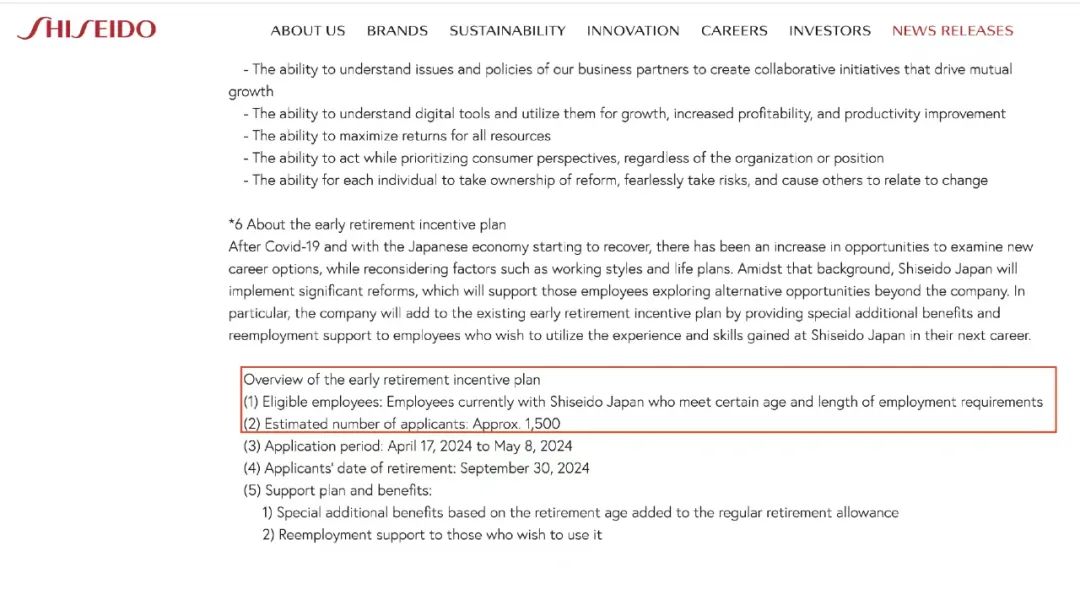 2月29日,資生堂集團在官網發(fā)布了一條針對其日本業(yè)務的“提前退休”計劃,指出今年將有1500名員工離職,占其全球員工總數的近4%,并同時對參與人員設定了嚴格的年齡和任期標準要求。