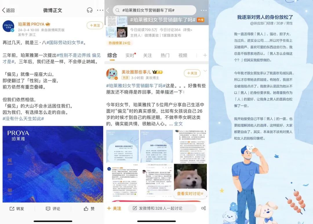 3月7日,#珀萊雅婦女節(jié)營銷翻車了嗎 登上微博熱搜,原因在于珀萊雅在此次策劃中邀請了五位用戶分享日常生活中面對「偏見」的真實經(jīng)歷和感受,其中出現(xiàn)了兩位男性。