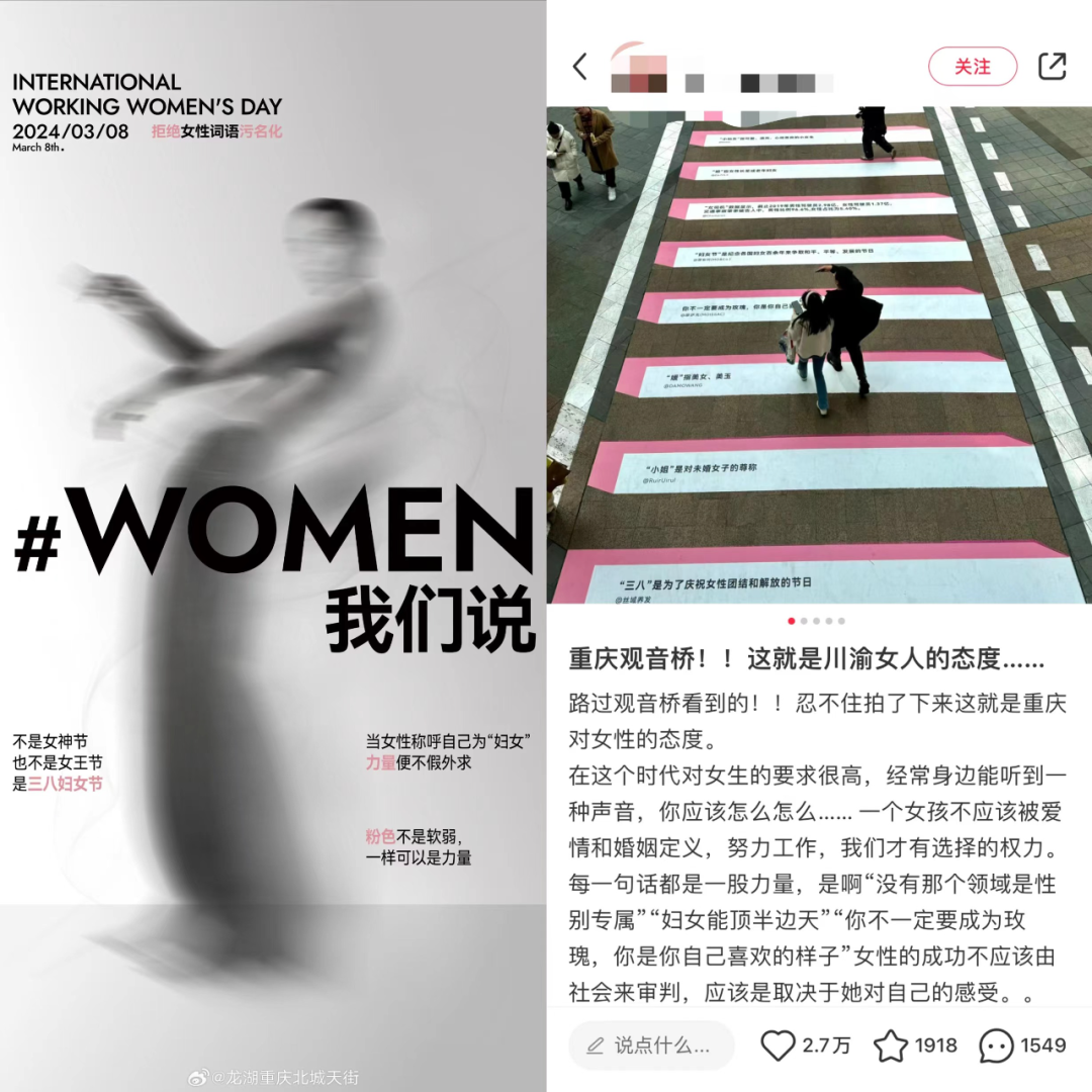 今年三八國際勞動婦女節(jié),龍湖重慶北城天街推出“WOMEN我們說”特別企劃活動,以斑馬線文案的形式出現(xiàn)在商場附近,向大家還原了婦女、圣母、名媛、小仙女、小姐等詞語原本的意義。