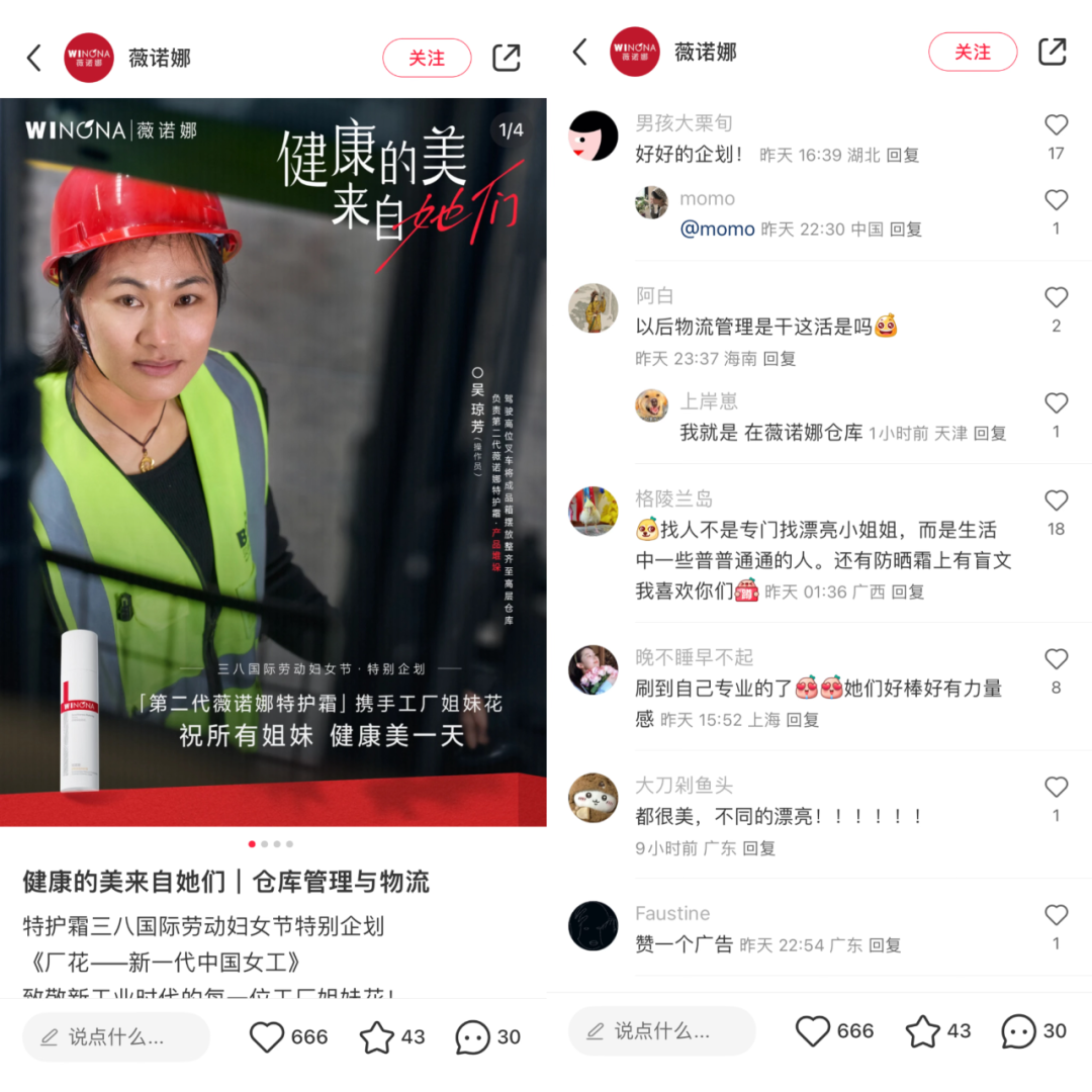 “她們是一群心急的人,當成品打包好運輸出流水線時,便迫不及待的駕駛運輸車和高位叉車將一箱一箱的特護霜,擺放在數(shù)米高的貨架上?!边@種真實而溫暖的故事,更容易引發(fā)人們的共鳴,同時也塑造了薇諾娜是一個關(guān)心員工、尊重勞動者的品牌形象。