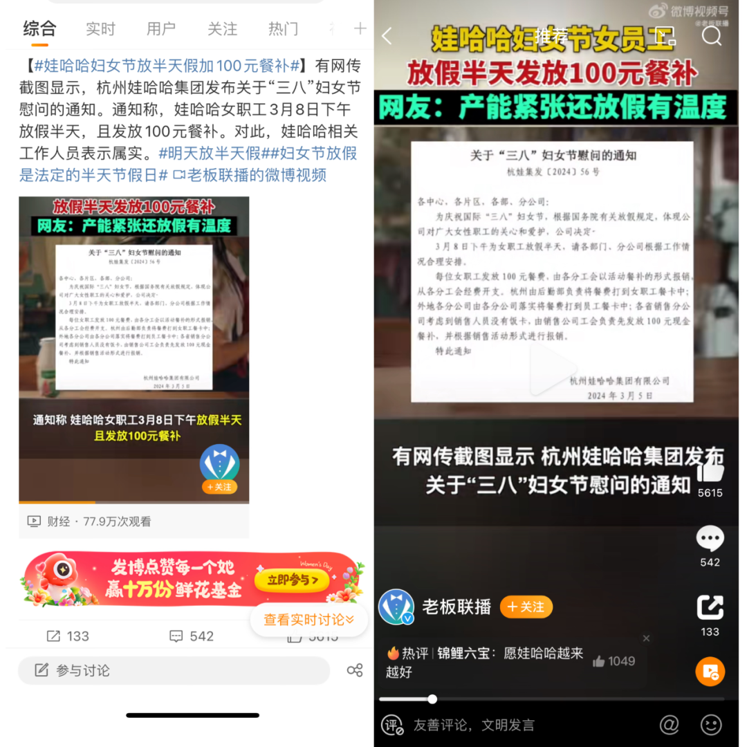 近期爆火的娃哈哈發(fā)布關(guān)于三八婦女節(jié)慰問通知,給女職工放假半天并發(fā)放100元餐補,彰顯了對女性職工的尊重和重視。