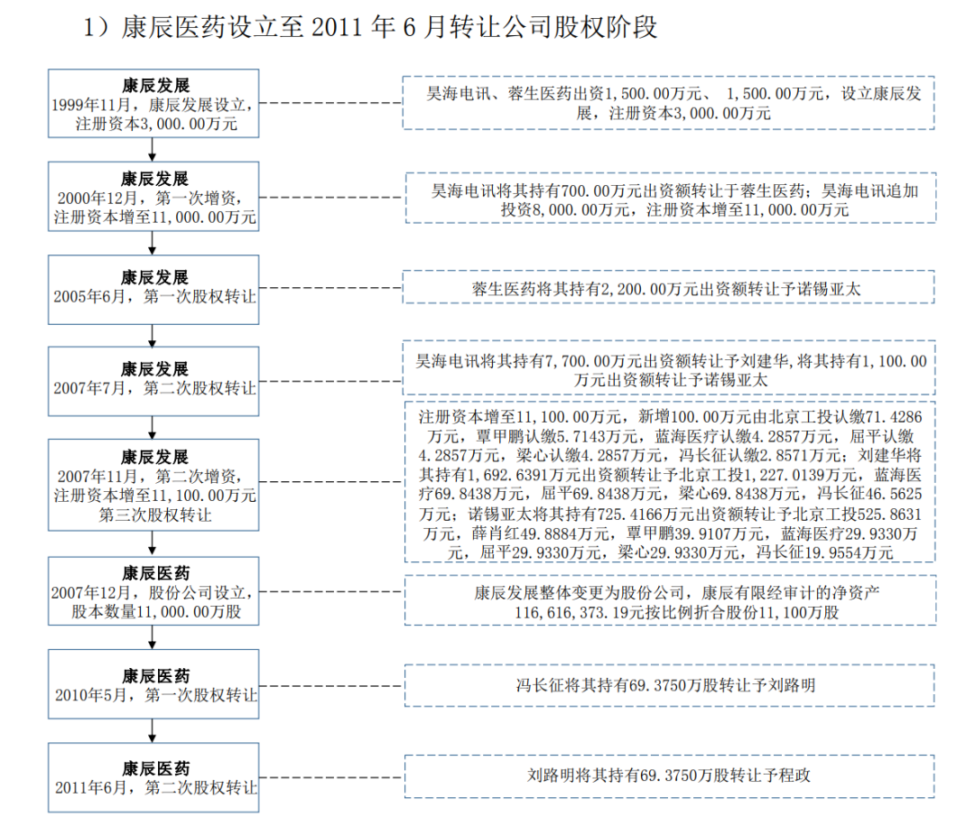 2011年6月,康辰醫(yī)藥和康辰藥業(yè)的股權(quán)架構(gòu)進(jìn)行了調(diào)整,康辰醫(yī)藥向相關(guān)股東轉(zhuǎn)讓康辰藥業(yè)的股權(quán)。