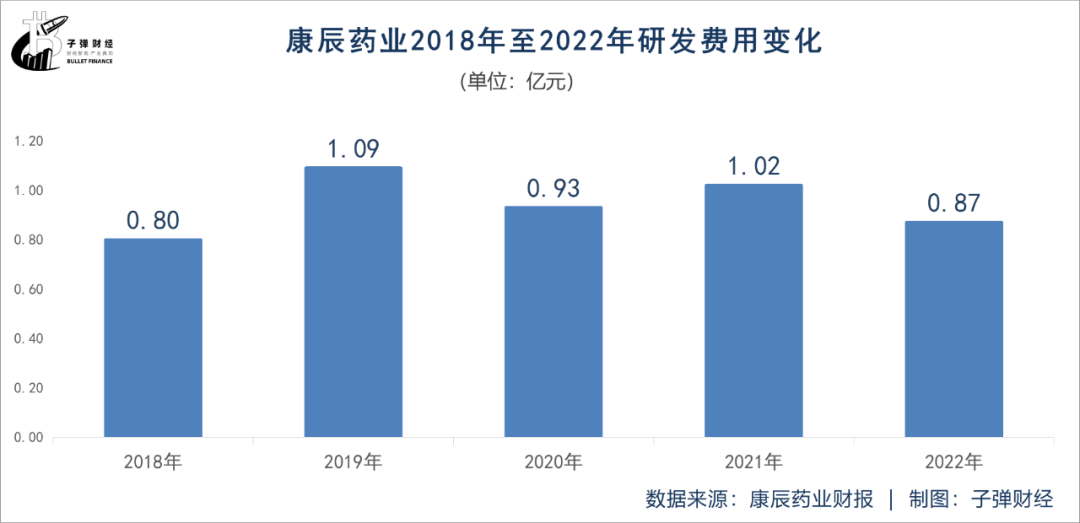 但是,2018年至2022年,康辰藥業(yè)研發(fā)費(fèi)用波動(dòng)較大。2022年,其研發(fā)費(fèi)用為0.87億元,低于2020年、2021年的研發(fā)費(fèi)用。