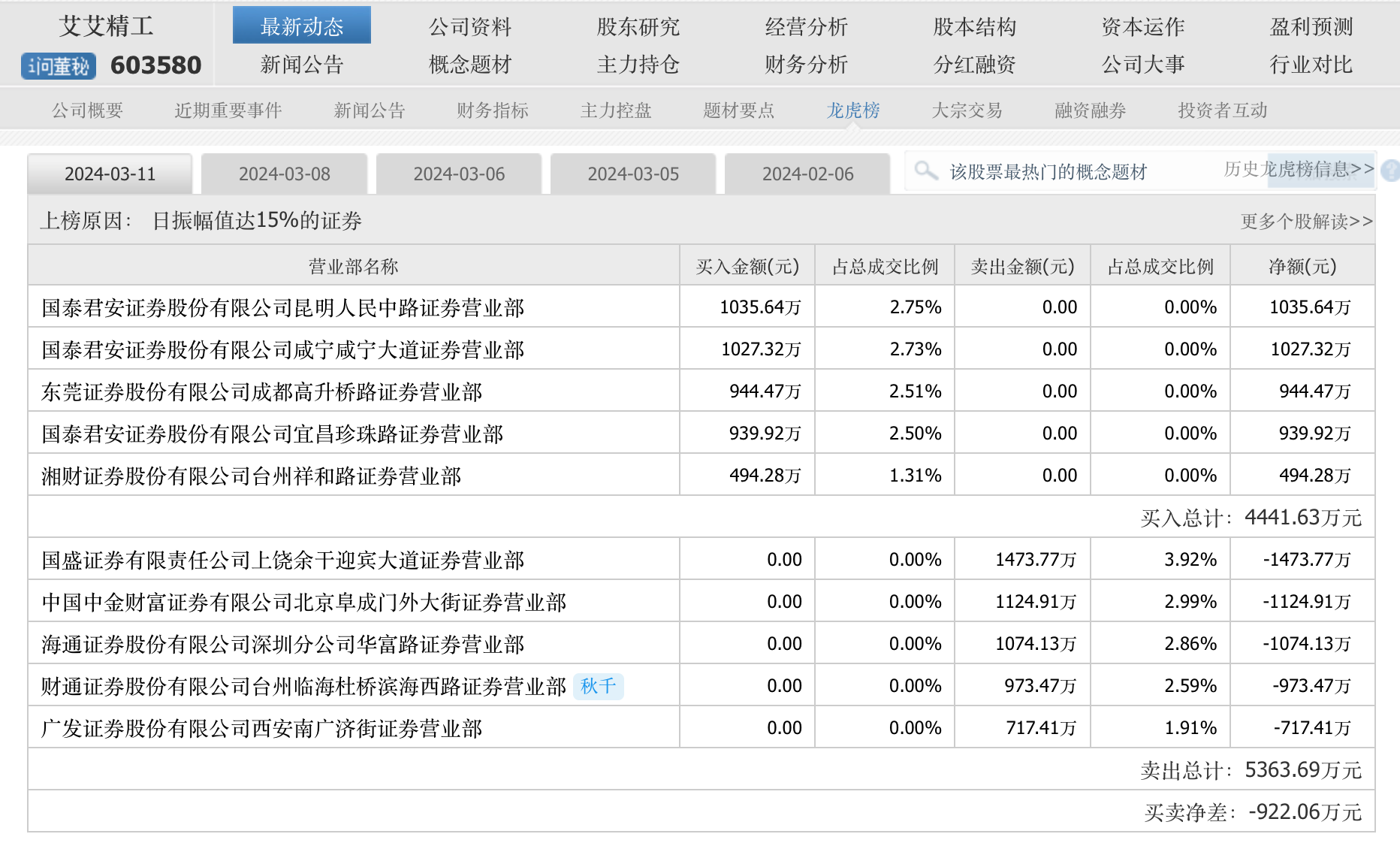 不過值得注意的是,雖說3月11日艾艾精工完成漲停,但盤中卻多次開板,籌碼鎖定不穩(wěn),全天的換手率達到了19.55%,收盤時漲停板位置也只有3602手買單在排隊。其龍虎榜顯示,當天買賣前五都是游資。買入較多的是國泰君安昆明人民中路營業(yè)部和國泰君安咸寧咸寧大道營業(yè)部,買入金額均超過了千萬元;賣出席位中國盛證券上饒余干迎賓大道營業(yè)部、中國中金財富北京阜城門外大街營業(yè)部、海通證券深圳分公司華富路營業(yè)部的賣出金額也都上了千萬元。尤其是買賣前五的凈差為-922.06萬元。