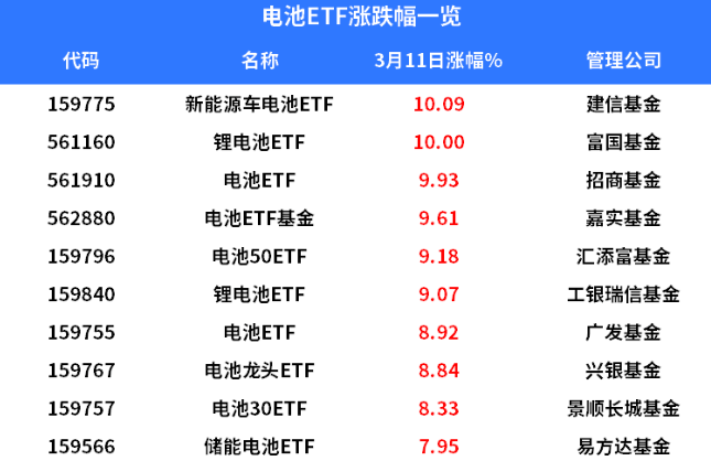 一個板塊出現(xiàn)幾家頭部公司漲停很常見,但幾乎整個板塊都實現(xiàn)漲停的情況卻極為罕見。這種罕見情況就發(fā)生在前幾天的鋰電板塊。3月11日,新能源車電池ETF、鋰電池ETF單日漲幅都在10%以上,市面上最主要的10支電池ETF單日漲幅都在7.9%以上。