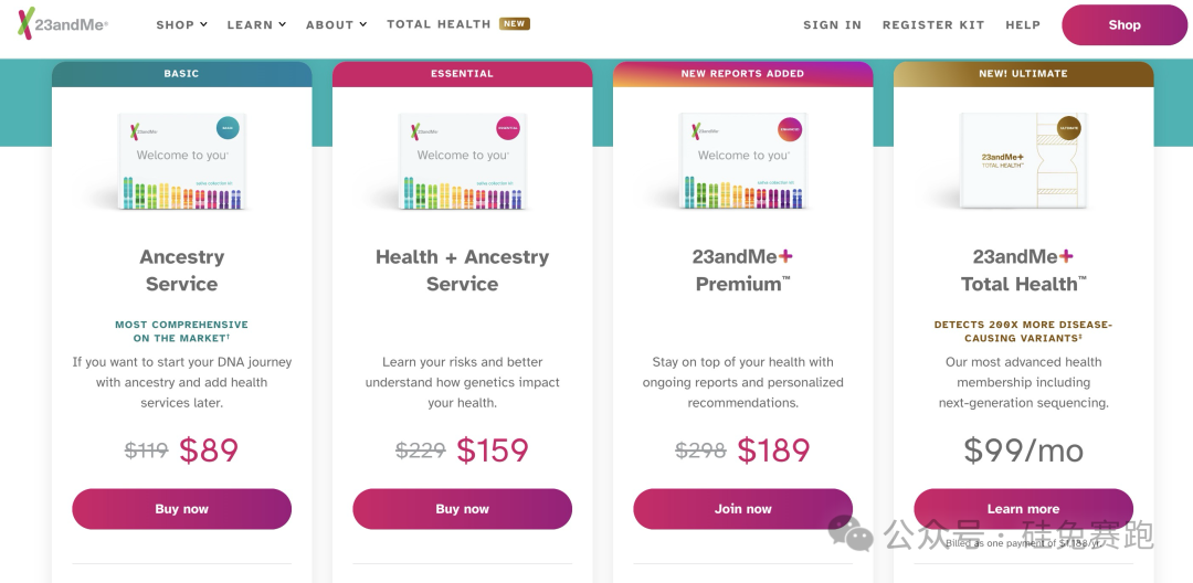 23andMe也在努力通過增加多元化服務(wù)創(chuàng)造收入,從僅提供信息的科技公司變?yōu)榧饶芴峁┬畔⒂帜芴峁┲委煹尼t(yī)療公司。比如,推出年度付費(fèi)產(chǎn)品Total Health,提供半年一次的血液測試、外顯子測序和基于遺傳學(xué)的臨床護(hù)理。