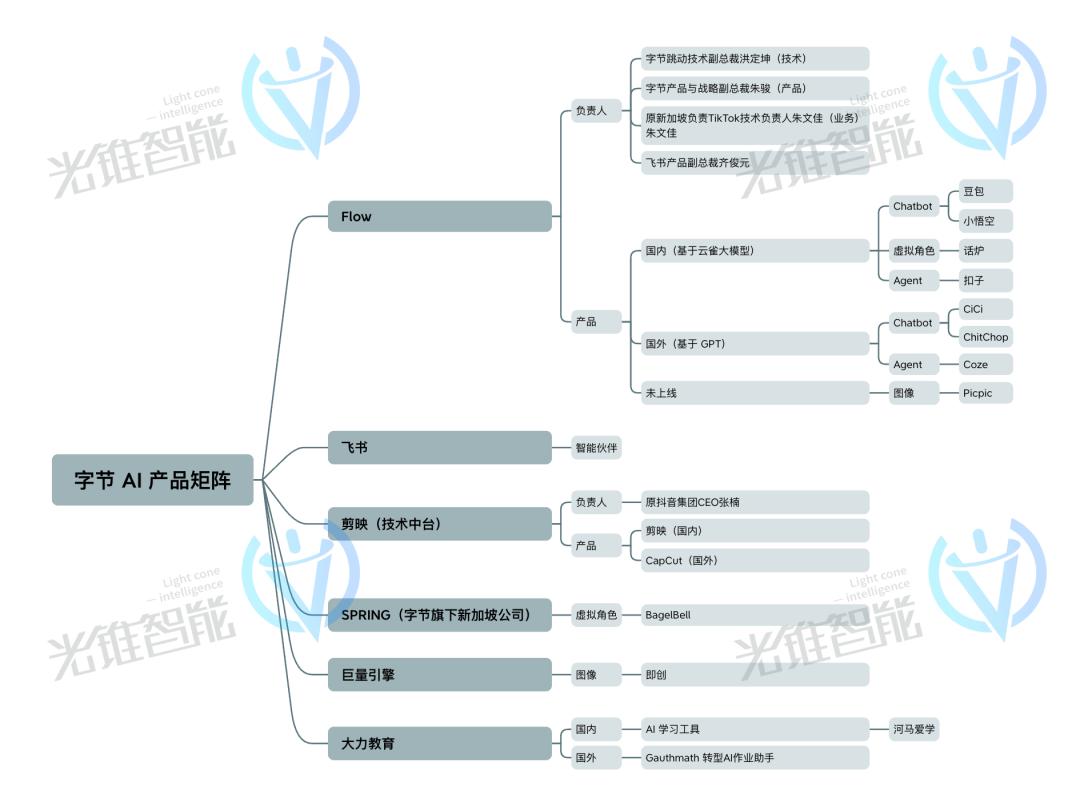 在字節(jié)大舉進軍之下,實現(xiàn)了多個應(yīng)用,多點開花的局面。據(jù)光錐智能不完全統(tǒng)計,從去年八月到現(xiàn)在,半年多的時間內(nèi),字節(jié)在海內(nèi)外共測試、上線了十一款A(yù)I應(yīng)用產(chǎn)品,一款圖像類的產(chǎn)品Picpic還未上線,這其中由Flow團隊主導(dǎo)研發(fā)的產(chǎn)品有八款。