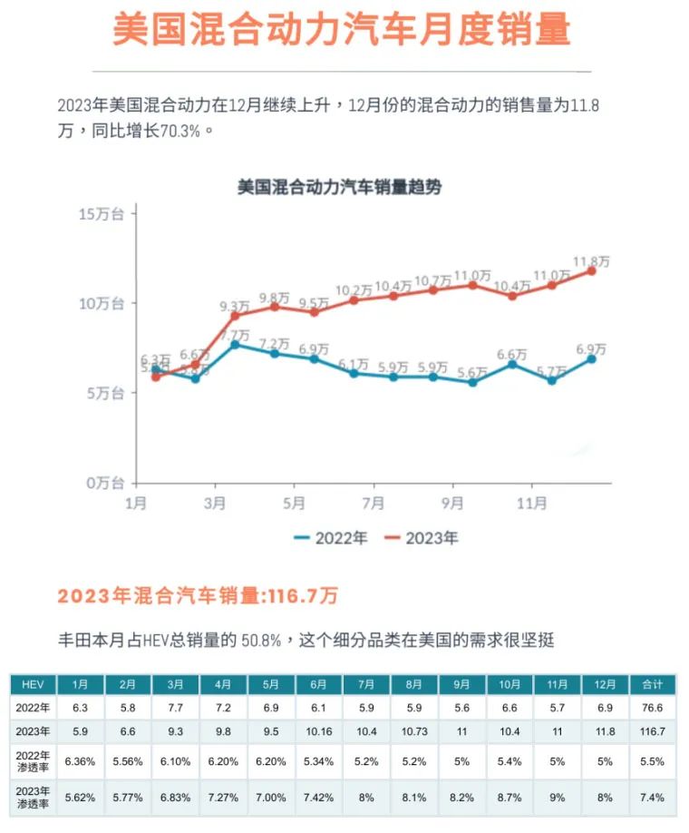 2023年美國市場的混合動力汽車銷量較2022年同期明顯上升,單看2023年12月的銷售量已經(jīng)達到11.77萬輛,同比增長達到驚人的70.3%。豐田汽車毫無疑問的占據(jù)了美國混動汽車市場的主導(dǎo)地位,銷售占比超過50%。