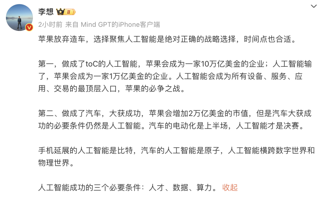 在這種情況下,蘋果放棄造車的消息就顯得既出人意料,又合情合理了。畢竟蘋果在造車這件事上左右搖擺,早已錯失先機,而可以成為所有設(shè)備、服務(wù)、應(yīng)用、交易頂層入口的人工智能才是更符合蘋果企業(yè)定位的戰(zhàn)略重點。