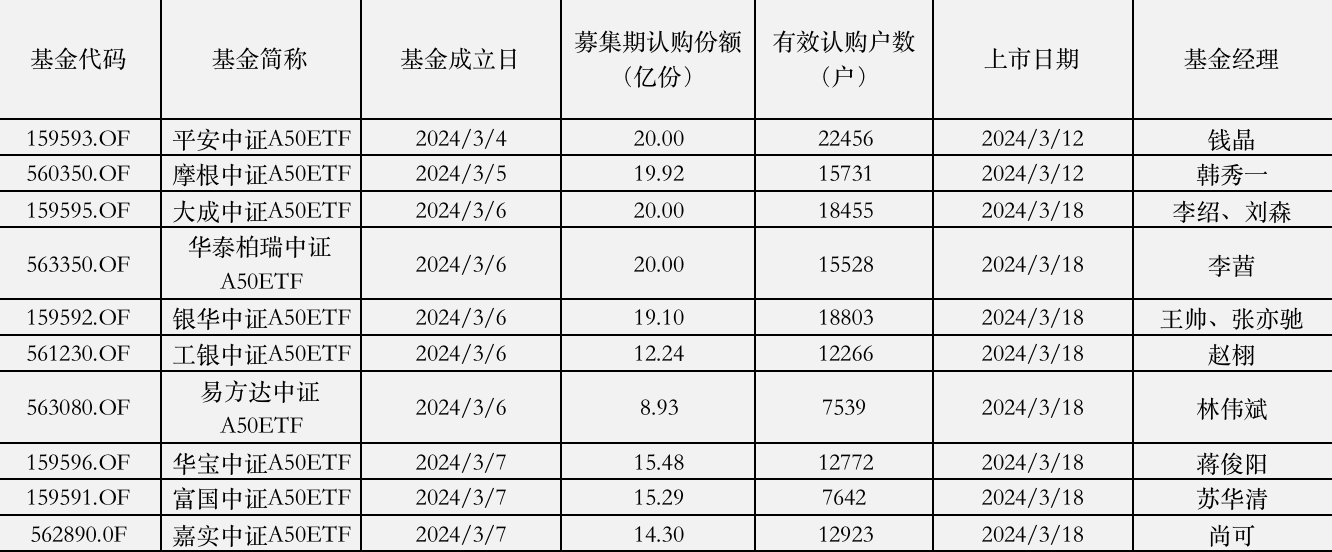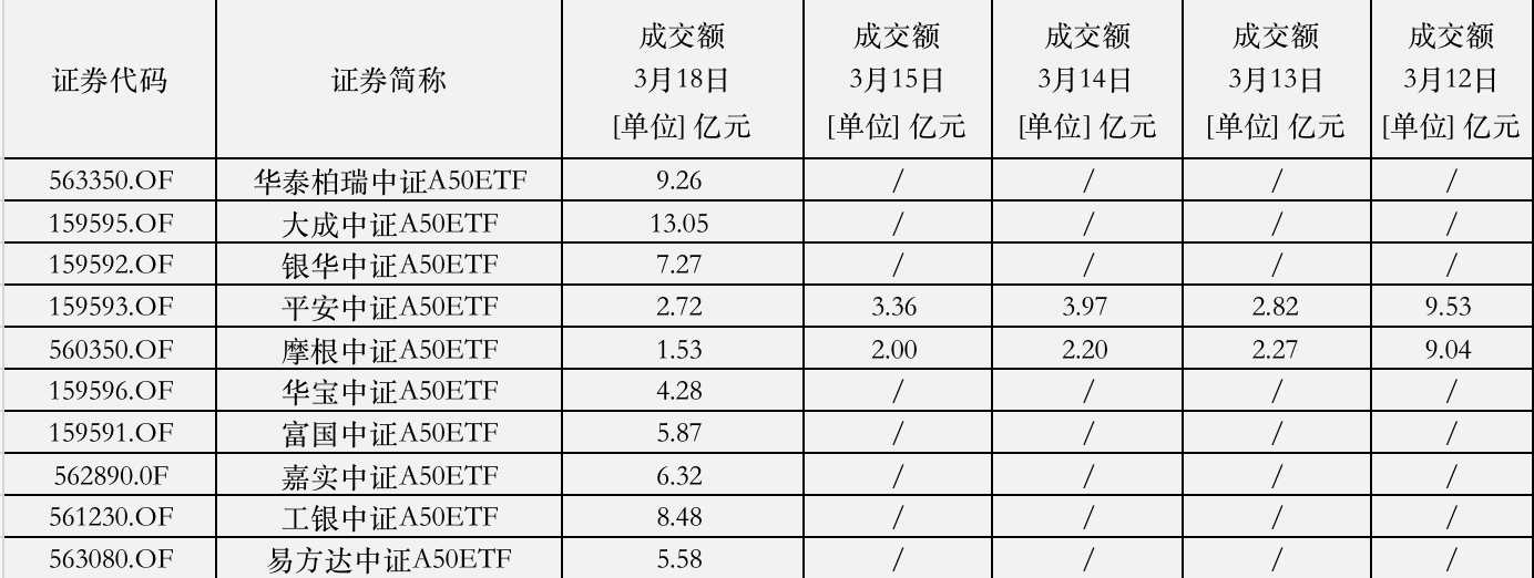 摩根中證A50ETF和平安中證A50ETF3月12日上市首日成交額也超9億元。3月12日至3月18日,摩根中證A50ETF累計(jì)成交額約17億元,平安中證A50ETF累計(jì)成交額約22億元。