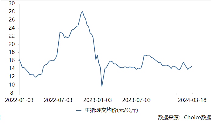 Choice數(shù)據(jù)顯示,生豬成交均價于2022年10月觸及28.11元/公斤的高點,隨后直線下行。最新價格為14.61元/公斤,仍在低位。