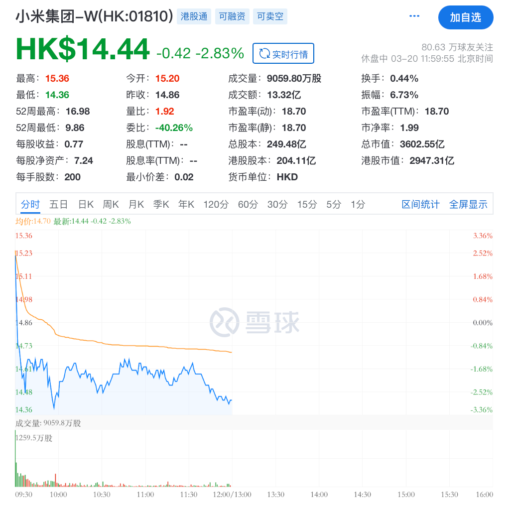 得益于此,小米在3月19日交出幾乎全面增長的年度成績單。業(yè)績超預(yù)期,卻并未助推其股價(jià)持續(xù)上漲。今日開盤一度漲超2%,隨后股價(jià)高臺跳水,目前跌近3%。
