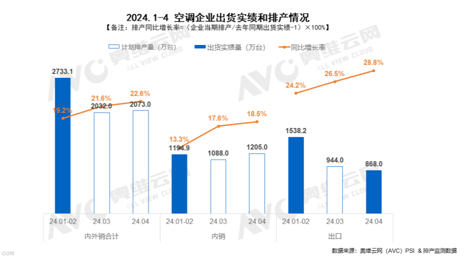 據(jù)奧維云網(wǎng)(AVC)排產(chǎn)監(jiān)測數(shù)據(jù),4月國內(nèi)家用空調(diào)總排產(chǎn)2073萬臺,其中內(nèi)銷排產(chǎn)1205萬臺,同比增長18.5%,出口排產(chǎn)868萬臺,同比增長28.8%。結(jié)合剛剛過去不久的AWE上各家空調(diào)新品發(fā)布百花齊放,以及近期企業(yè)營銷活動此起彼伏,似乎透露出各大空調(diào)品牌方都對今年空調(diào)旺季市場有著不小的期待。然而,市場真的會如預(yù)期嗎?