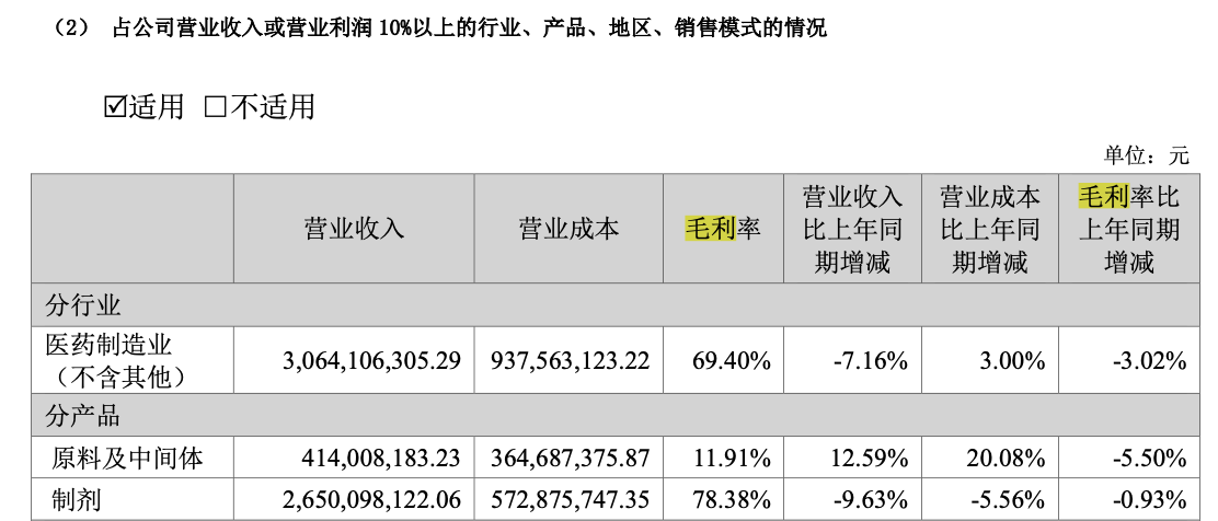 從業(yè)績增速來看,這也是信立泰自2020年之后再次出現(xiàn)下滑。其中,去年公司的毛利率尤其是原料及中間體的毛利率出現(xiàn)明顯下滑,創(chuàng)近十年新低。
