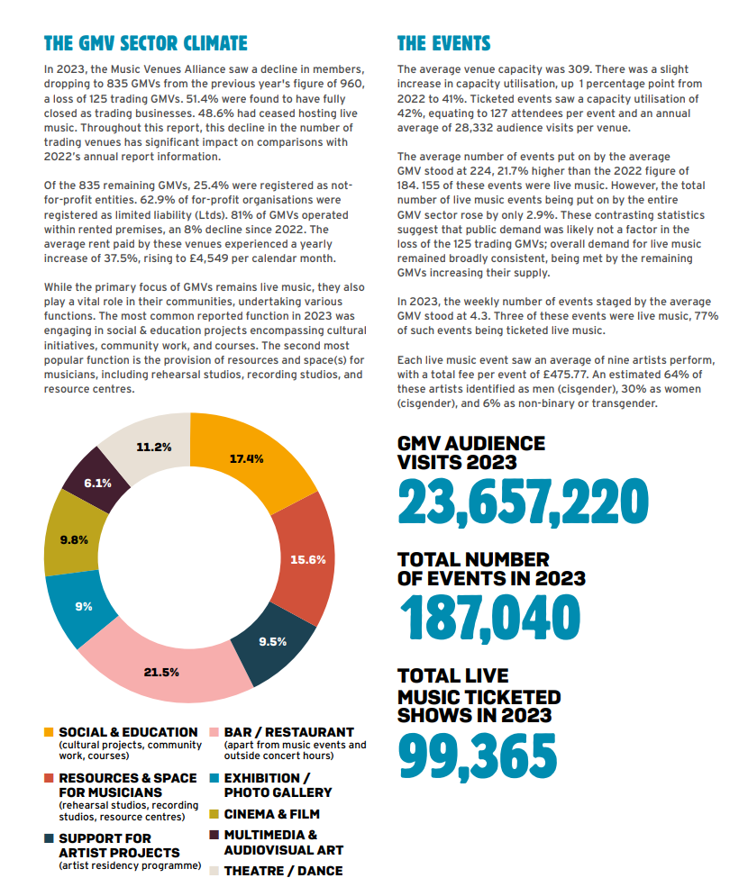 根據(jù)外媒MBW報(bào)道,據(jù)英國音樂演出慈善機(jī)構(gòu)MVT(音樂場(chǎng)館信托基金)統(tǒng)計(jì),在過去一年里,平均每周有兩家基層音樂場(chǎng)館(Grassroots Music Venues, GMVs)關(guān)閉,指的是平均可容納309人,但極限容量可能超過650人的場(chǎng)館。更令人震驚的是,在其《2023年度報(bào)告》中顯示,38.5%的基層音樂俱樂部出現(xiàn)年度財(cái)務(wù)虧損的情況。
