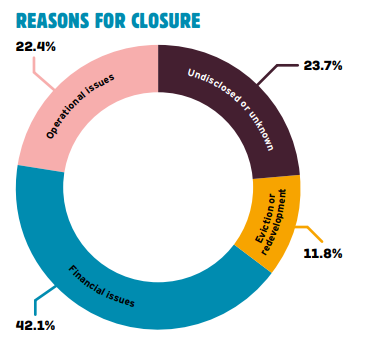 報(bào)告提到,經(jīng)調(diào)研,42.1%場(chǎng)館因?yàn)榻?jīng)濟(jì)原因?qū)е玛P(guān)閉,22.4%是因?yàn)檫\(yùn)營困難。其中,以下原因被認(rèn)定為導(dǎo)致永久關(guān)閉的原因,如因能源價(jià)格、商業(yè)稅率、供應(yīng)成本或租金導(dǎo)致的債務(wù)和破產(chǎn);客流量減少和運(yùn)營成本的提升導(dǎo)致的財(cái)務(wù)困境;疫情導(dǎo)致的相關(guān)限制措施,以及對(duì)經(jīng)濟(jì)和物流的影響;噪音減少令的頒布、其他與場(chǎng)所活動(dòng)相關(guān)的糾紛;場(chǎng)所的營業(yè)執(zhí)照被吊銷或無法實(shí)現(xiàn)的執(zhí)照更新條款;場(chǎng)地建筑為重新開發(fā)改造而被出售等。
