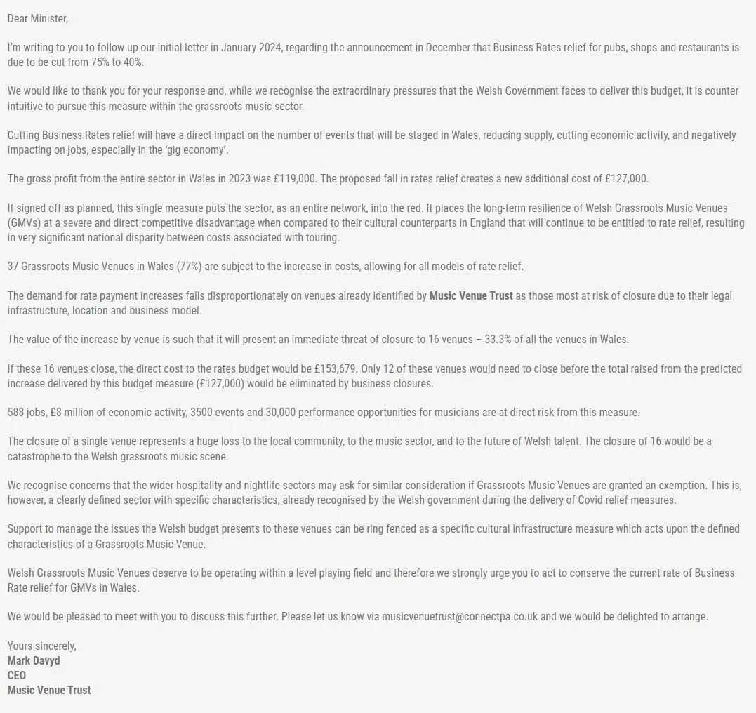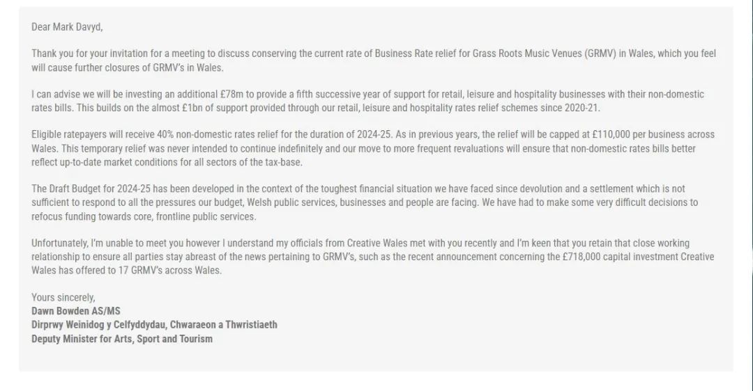 Mark Davyd表示,目前MVT已經(jīng)在初步嘗試一些解決的辦法。在今年年初,他寫信給英格蘭威爾士政府,請(qǐng)求政府重新考慮對(duì)小型音樂俱樂部的商業(yè)稅減免政策。信中強(qiáng)調(diào)了減少稅收減免對(duì)威爾士草根音樂場(chǎng)景的潛在負(fù)面影響,并呼吁保持75%的稅收減免率,以避免對(duì)文化場(chǎng)所造成經(jīng)濟(jì)損失和關(guān)閉風(fēng)險(xiǎn)。
