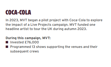 在這方面,或許也可從MVT發(fā)布的年度報(bào)告中獲得啟發(fā)。如在2023年,MVT聯(lián)合可口可樂發(fā)起試點(diǎn)項(xiàng)目,投資76,000英鎊資助一名藝術(shù)家在英國發(fā)起十三場(chǎng)巡演。而在國內(nèi)Livehouse行業(yè)峰會(huì)上,這類商業(yè)音樂活動(dòng)的討論也頗受關(guān)注,如街聲StreetVoice演出事業(yè)中心副總經(jīng)理Emilie提到Livehouse經(jīng)營者可以探索帶有個(gè)人特色和品味的歌單,尋找不同的派對(duì)主題。