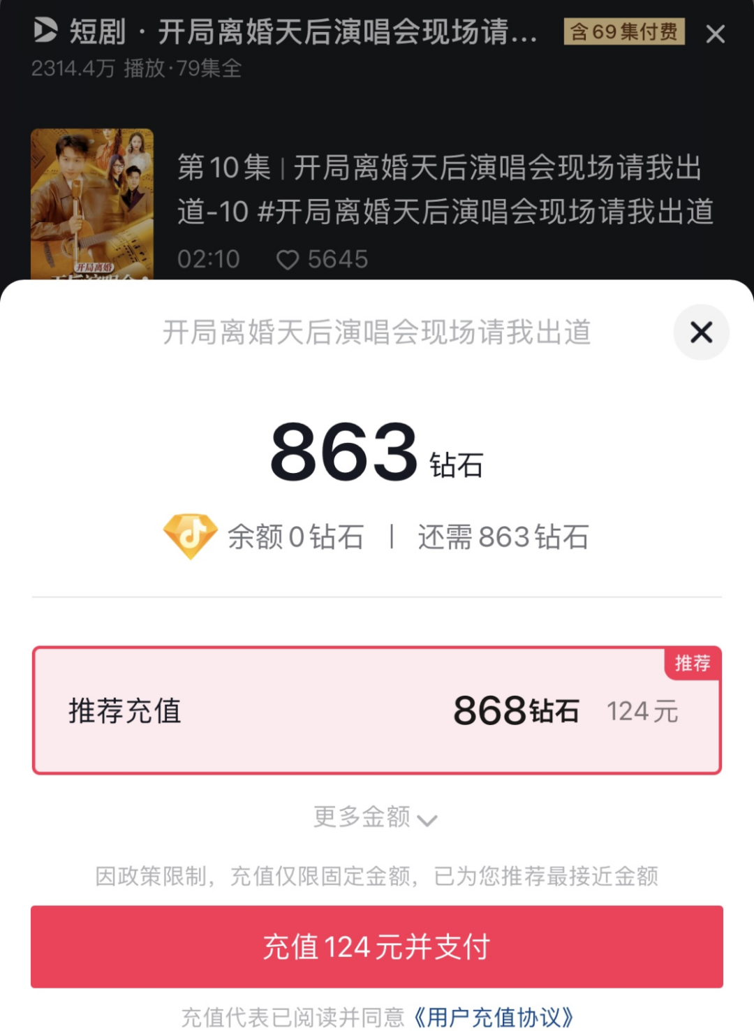 該劇共79集,前十集免費(fèi),共69集付費(fèi)。從抖音小程序的界面上,看完整部劇,要充值124元,折算平均一集要花費(fèi)1.5元以上。價(jià)格偏高。